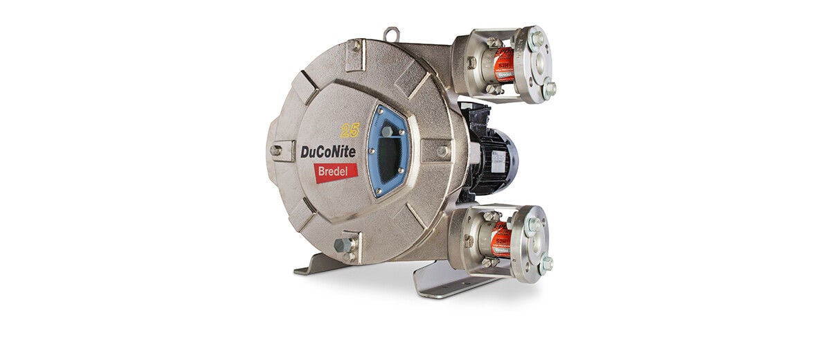 Bredel DuCoNite® pumps with a paint-free electroplated housing which protects against corrosive and caustic fluids and atmospheres. The DuCoNite® pump is used for the most challenging applications. A high-tech surface protection method has rendered the pump ultra-resistant to aggressive liquids. The DuCoNite® hose pumps are available in five pump sizes - with capacities up to 5,250 L/h and pressures up to 16 bar. The DuCoNite® hose pump reliably handles a variety of harsh materials, such as sodium hypochlorite, titanium dioxide, sodium hydroxide, catalytic agents, sulfuric acid, lime slurry, acidic liquids, solvents and resins.